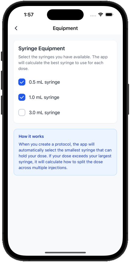 Tell PeptideTrack what syringes you own, and the app adapts to your equipment. This prevents impossible doses by only showing draw volumes that work with your actual syringes. Smart syringe selection means you always get practical, usable instructions.