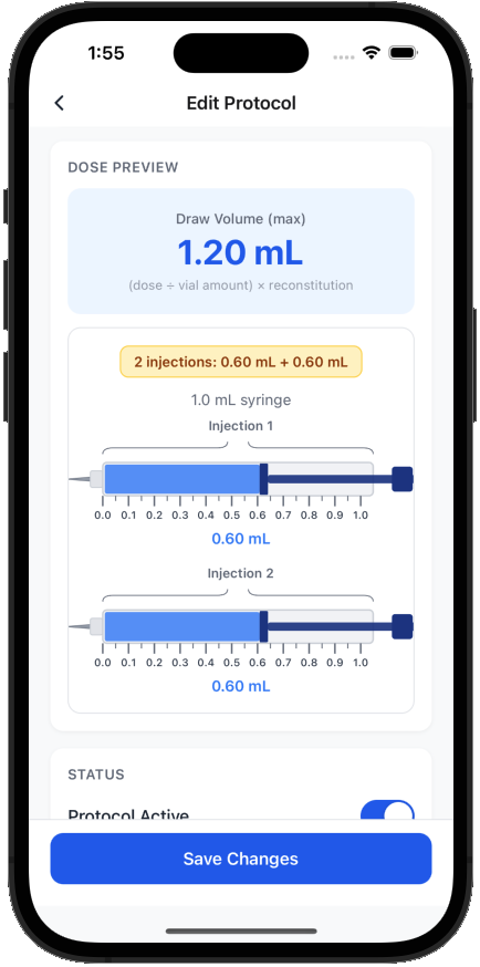 What happens when your calculated dose is too large for a single syringe? PeptideTrack automatically calculates how to split your dose across multiple draws. You'll see exactly how much to draw each time, ensuring you get your full dose without exceeding syringe capacity.